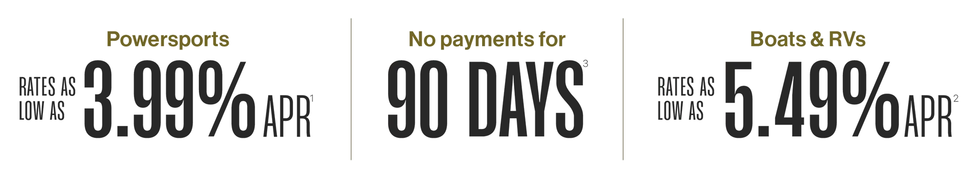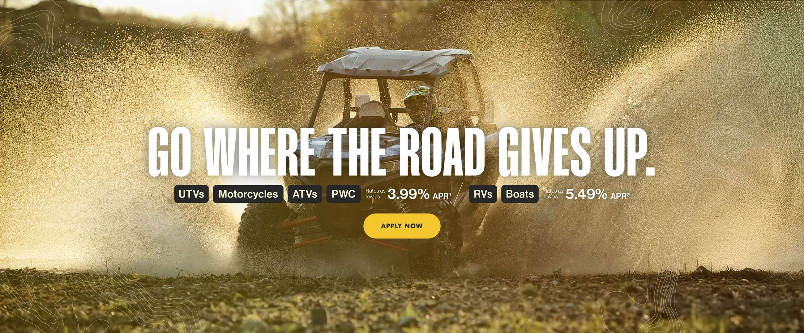 RATES AS LOW AS 3.99% APR¹Dirt, gravel, snow, sand—wherever the trail points, powersports are about getting off the beaten path. Our Powersports Loans are designed to keep your payment as agile as your ride, with competitive rates and flexible terms that make it easier to say yes when adventure calls.